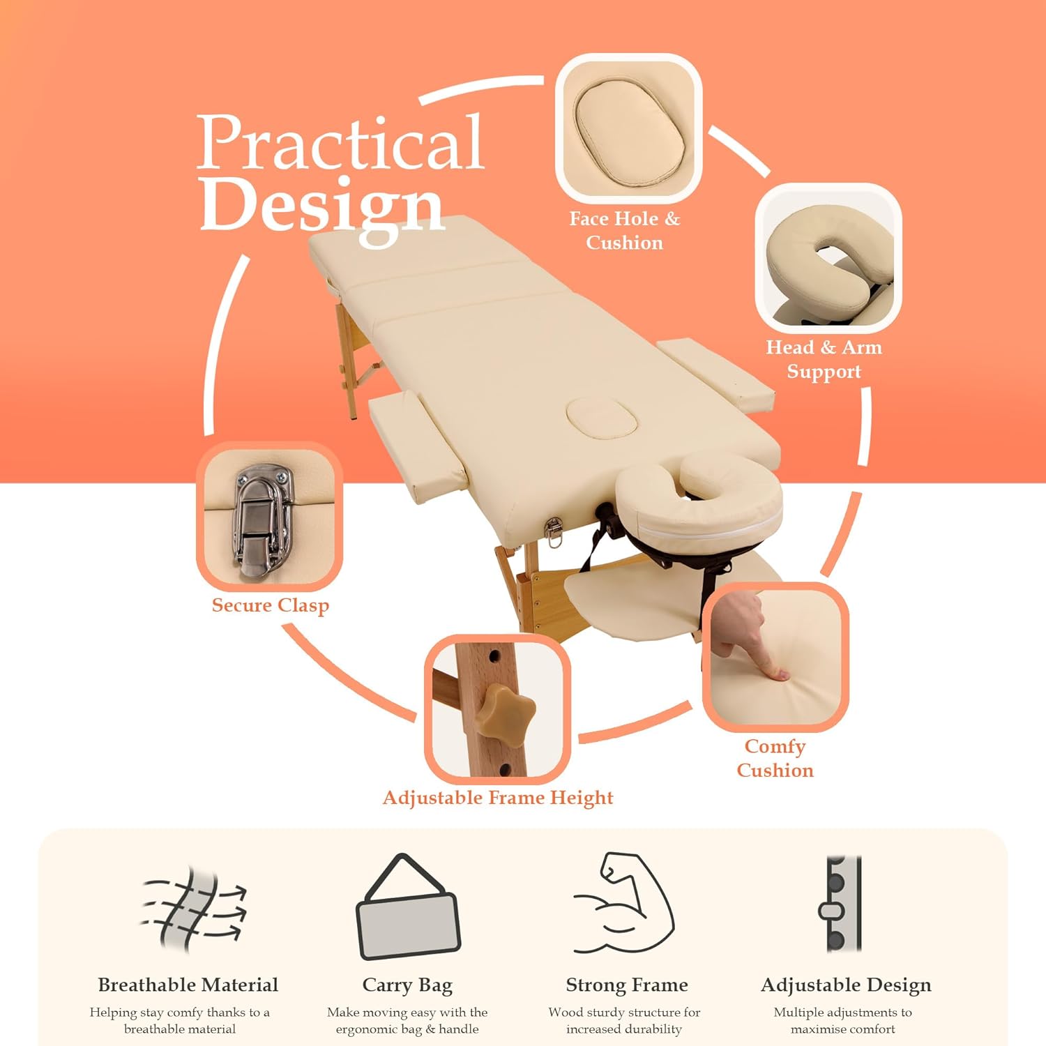 - STRONG WOODEN FRAME FOR STABILITY & DURABILITY - Built with a solid beech wood frame, reinforced steel cables and non-slip feet, the table ensures maximum stability during use. It supports various body types confidently and safely, making it ideal for professional spa services, therapy work and mobile beauticians. Clients can fully relax knowing they’re supported on a high-quality, durable surface designed for consistent use.
